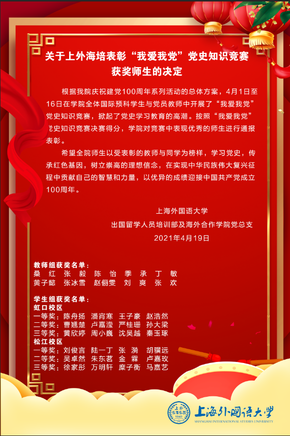 为庆祝中国共产党成立100周年,增加师生对于党史知识的了解,加深对于党的路线、方针和政策的理解,激励师生的历史责任感和使命感,出国人员培训部、海外合作学院党总支近期面向全体师生组织开展了“我爱我党”建党100周年党史知识竞赛。