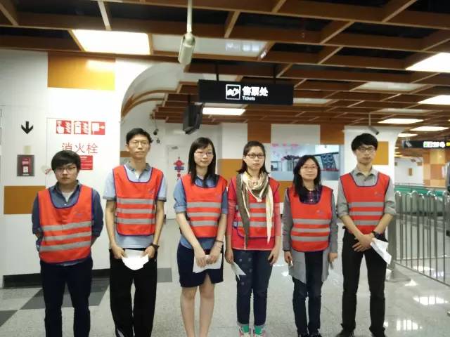 到达地铁站后,同学们换上工作服并从站长手中接过地图,随后由志愿者领队指导,被分配在各自岗位上,随时准备着为有困惑的行人释疑。最开始的一段时间,可能由于紧张,同学们的反应会有一些缓慢,甚至需要求助于领队。但是,在一段时间后,同学们渐渐习惯了环境,掌握了自己所处区域的周围和行人可能问出的问题,并能够对行人的提问做出快速的应答和应对,在用言语解释不清的情况下,同学们也会直接带领着行人走向正确的方向。
