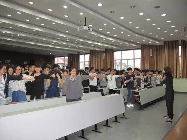 在讲座的第二部分中,刘教官以实际案例为切入点,与在场学生分享了如何在紧急情况下选择合适的逃生姿势,演示了正确的卧倒姿势,解释了如何选择掩体,并传授了一些国际通用的应急手语,涉及数字、人物类别、位置等的表达。讲座的最后,日本项目和新西兰项目的十六名学生上台进行实际演练,用新学的应急手语向全场师生正确传递了模拟情景中的信息,为这次培训画上了句号。