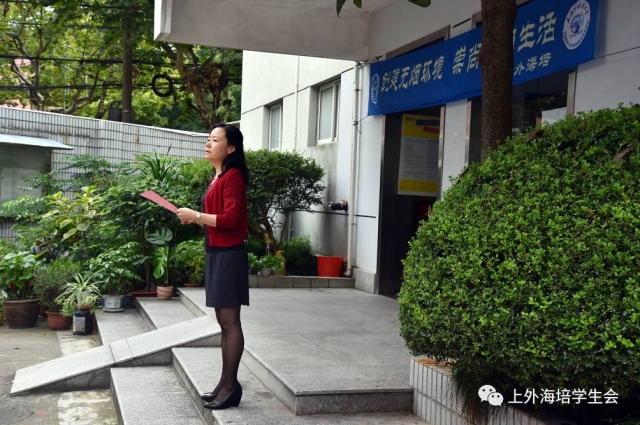 为了呼吁大家珍爱生命,远离香烟,自觉遵守公共场所禁止吸烟的规定,努力营造一个健康、清洁、禁烟的良好校园环境,上外海培虹口校区于2017年10月9日开展了“创造无烟环境、崇尚文明生活”校园禁烟的师生签名活动。 中午11:30,活动准时开始。首先,学院总支书记张缅宣读了安全委员名单并提出殷切希望:安全委员要增强主人翁意识,认真履行职责,配合学院完成校园安全巡视、绿色禁烟、寝室检查等工作,努力成为上外海培安全防范、维护校园稳定的安全卫士。