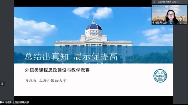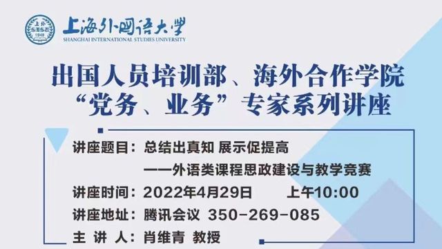 2022年4月29日,上海外国语大学出国留学人员培训部及海外合作学院举行“党务、业务”专家系列讲座,邀请英语学院肖维青教授为主讲嘉宾,围绕外语类课程思政建设与教学竞赛的主题,分享她在课程思政建设中实现“经师”与“人师”相统一的真知灼见。党总支书记张缅主持讲座,部门党政班子成员及教工支部全体党员通过腾讯会议平台聆听了此次讲座。