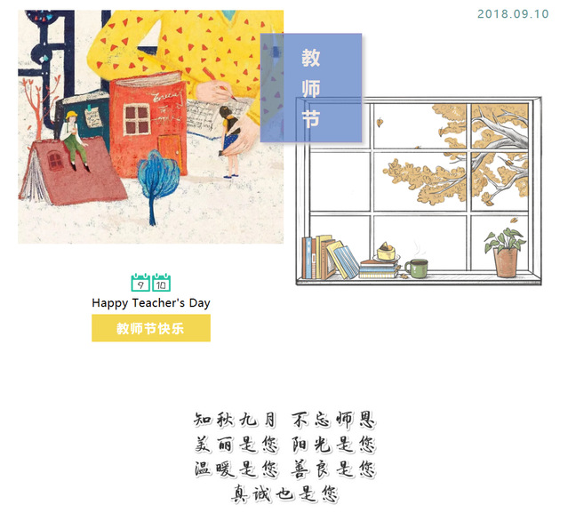 九月,如期而至 世界因此灿烂 我们歌唱九月,因为这是您永恒的节日 我们牢记九月,因为这是我们真诚的表白 九月,是只情满四溢的杯子 我们用双手高高地举起,在一片真诚的祝福声中 请您干杯 “春蚕到死丝方尽,蜡炬成灰泪始干” 我们一生遇到多少老师 就能有多少盏灯照亮人生旅程 愿我们一路上都有明灯指引 每一盏灯都光亮如初 又是一年教师节,祝老师们: 教师节快乐 桃李满天下 __________________________________________________________________________________________ 文字编辑:王穆然 图片来源:学生会全体 排版:刘恩宇