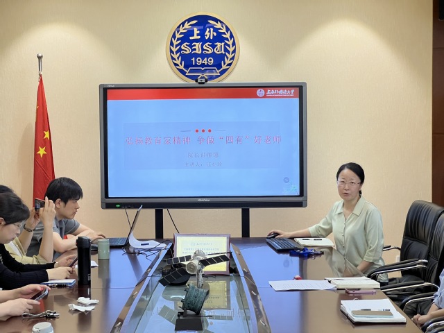 为全面贯彻习近平总书记关于教育的重要论述和全国教育大会精神,进一步增强教师思想政治素质和师德师风水平,高质量开展师德教育学习,7月5日上午,上海外国语大学出国留学人员培训部及海外合作学院召开“院长讲师德”专题教育活动。本次教育活动以“弘扬教育家精神,争做‘四有’好老师”为主题,由汪小玲院长主讲,学院全体教职员工参加了本次讲座。