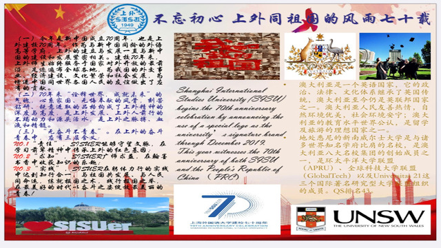 作者:张缅 为有效推进“不忘初心、牢记使命”主题教育,大力弘扬爱国主义精神,鼓励出国培训部、海外合作学院师生以饱满积极的精神面貌迎接庆祝建国、建校七十周年,近期,出国培训部、海外合作学院举办建校七十周年系列活动:“奋斗的我,最美的国”班级板报宣传展示活动。 本次主题海报宣传活动充分展示了出国培训部、海外合作学院学子蓬勃向上的精神风貌,积极传递了“信念坚定、志存高远、勤勉好学、自立自强、民族融合、爱国报国”等青春名片,在大力唱响主旋律,弘扬正能量的同时,增强了“不忘初心、牢记使命”主题教育的针对性和实效性,传达出国家、学校和师生共同奋斗的精神,营造出了师生团结奋进的浓厚学习氛围。使出国培训部、海外合作学院全体师生学有榜样、赶有目标,自觉践行社会主义核心价值观,为新中国和校庆送上一份用心的生日礼物。